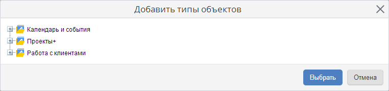 Типы объектов - блок, содержащий список типов объектов трудозатрат, для которых в отчете по трудозатратам может быть выбран настраиваемый вид деятельности. Данный блок доступен только в случае, если переключатель Все типы объектов установлен в значение Нет. Для добавления типа объекта в список необходимо нажать кнопку Добавить тип объекта. Отобразится окно Добавить типы объектов, в котором перечислены объекты трудозатрат (рис.4). В этом окне необходимо отметить флажками типы объектов трудозатрат, для которых в отчете по трудозатратам может быть выбран настраиваемый вид деятельности. Для завершения процедуры добавления необходимо нажать кнопку Выбрать. Для отмены операции добавления необходимо нажать кнопку Отмена.