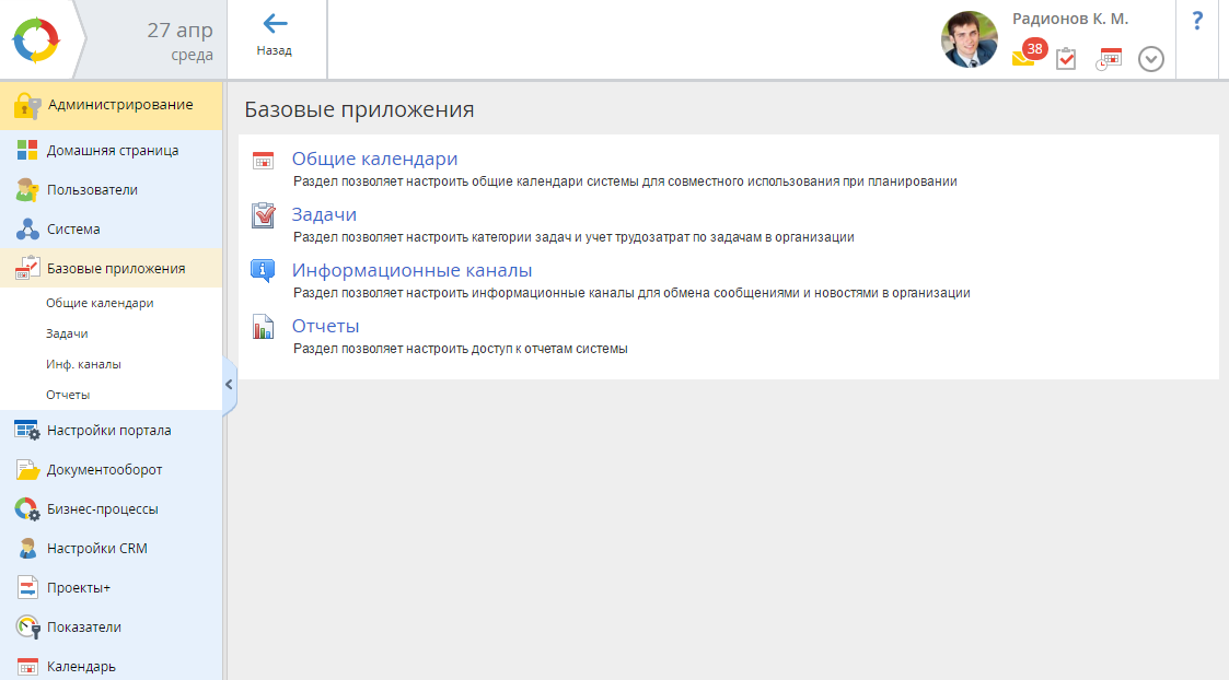 Настройки базовых приложений системы ELMA осуществляются в разделе Администрирование – Базовые приложения.