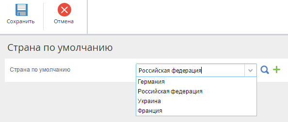 Для установки страны по умолчанию необходимо нажать на название данного раздела, на открывшейся странице (рис. 2) выбрать необходимую страну из выпадающего списка и нажать на кнопку Сохранить. В выпадающем списке отображаются записи справочникаСтрана.