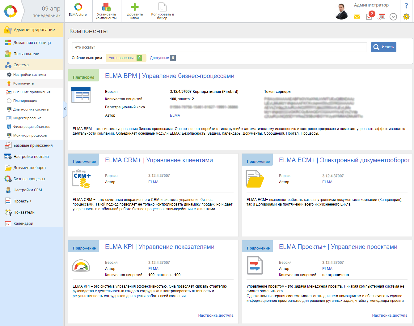 Полная информация об установленных и доступных для установки компонентах системы ELMA отображается в разделе Администрирование – Система – Компоненты (рис. 1).