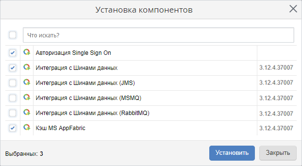 Выбор компонентов, доступных для установки, а также их установка. При нажатии на данную кнопку осуществляется открытие диалогового окна (рис. 2), в котором необходимо выбрать требуемые для установки компоненты (путем установки флажков) и нажать на кнопку Установить.