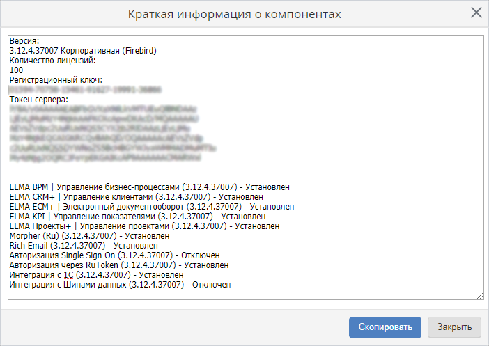 Копирование в буфер обмена информации о состоянии лицензий и составе модулей системы ELMA. При нажатии на данную кнопку будет открыто диалоговое окно, содержащее копируемый текст (рис. 3). В данном окне необходимо выделить требуемую часть текста и нажать на кнопку Скопировать. По умолчанию весь текст в данном окне выделен.