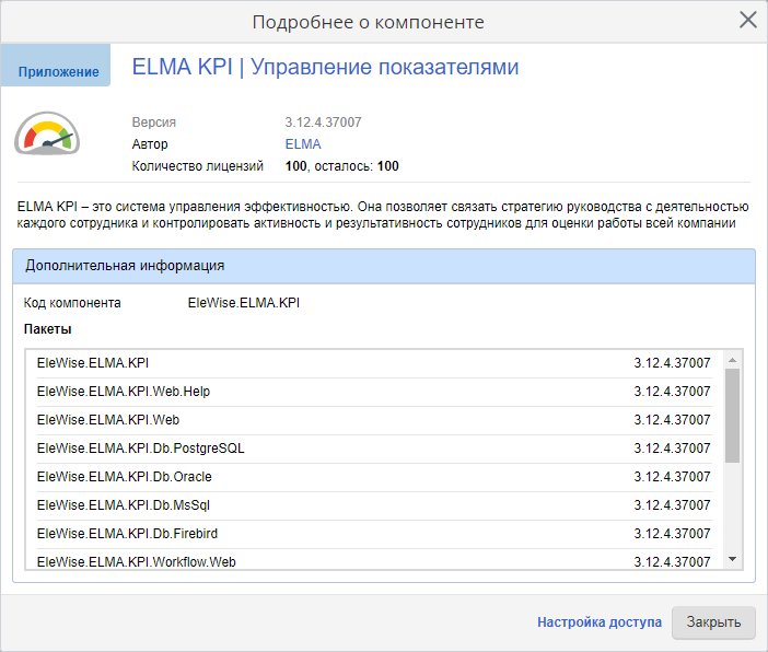 В нижней части данного диалогового окна расположена кнопка Настройка доступа, при нажатии на которую осуществляется автоматический переход на страницу редактирования группы пользователей, имеющих права на работу с данным компонентом. Для закрытия данного диалогового окна необходимо нажать на кнопку Закрыть.