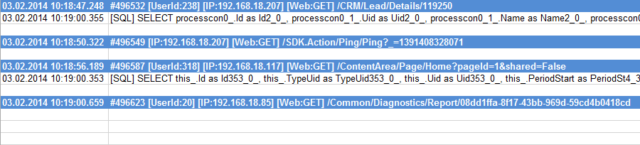 Журнал активных сессий (DiagnosticsActiveSession) – информация, которая передается во время выполнения веб-запросов, фоновых задач и т.д, но удаляется из файла журнала по их завершении. Данный журнал может использоваться для выяснения причин ошибок системы: при просмотре активных сессий доступна возможность воспроизвести ошибки и отследить проблему в файле журнала.