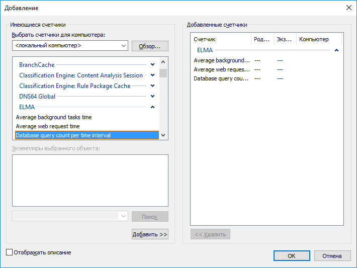 В появившемся окне (рис. 12) в блоке Имеющиеся счетчики отображаются все счетчики, присутствующие в операционной системе Windows. В группе ELMA отображаются счетчики производительности, записываемые сервером ELMA. Для добавления счетчиков в системный монитор необходимо выбрать их в списке и нажать кнопку