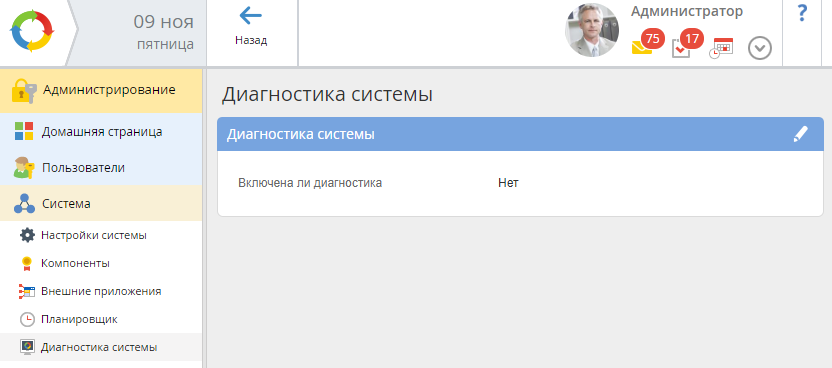 Настройка параметров диагностики системы выполняется в разделе Администрирование – Система – Диагностика системы.