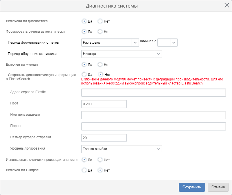в разделе Администрирование – Система – Диагностика системы и позволяет настроить параметры формирования и записи диагностической информации о событиях, ошибках и производительности системы ELMA (рис. 2).