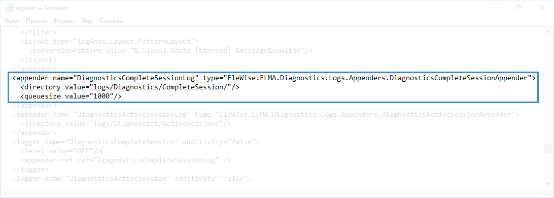Запись журналов активных и завершенных сессий включается в файле ../<Общая папка с файлами системы ELMA>/Web/Config/log4net. Данный файл содержит следующие данные: