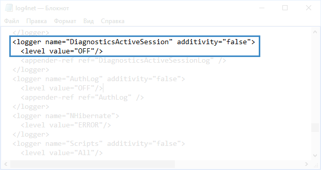 Для включения Журнала активных сессий необходимо в файле log4net.config изменить значение параметра level value с "OFF" на "ALL" (рис. 4).