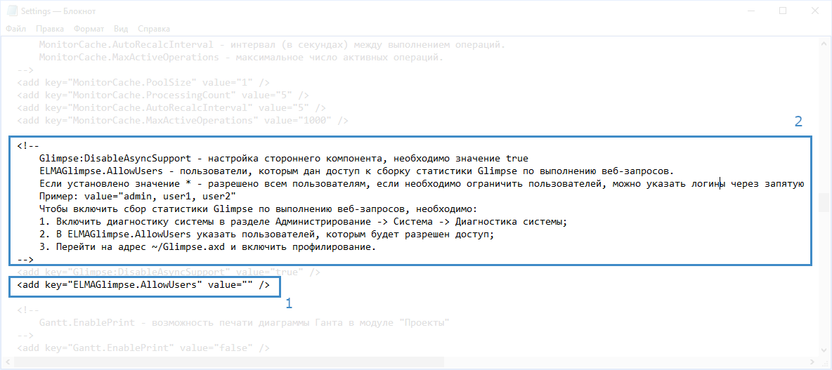 Настройка системы для работы с Glimpse происходит в файле ../<Общая папка с файлами системы ELMA>/Web/Settings. В строке назначения прав доступа к компоненту необходимо перечислить логины пользователей, которым разрешен доступ к Glimpse (рис. 5, пункт 1). В том случае, если необходимо разрешить доступ всем пользователям, следует установить значение *. Подробная инструкция по настройке Glimpse также содержится в файле Settings.config (рис. 5, пункт 2).