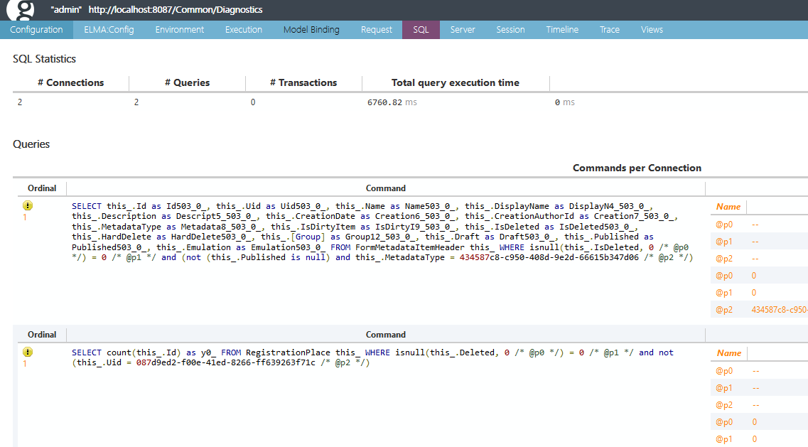 Окно платформы Glimpse содержит несколько вкладок. Для быстрой диагностики необходимо перейти на вкладку SQL, на которой отображаются все SQL-запросы, которые были сгенерированы при формировании веб-страницы (рис. 6).