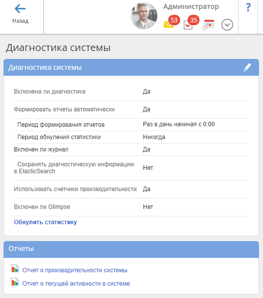 Рис. 8. Раздел "Администрирование – Система – Диагностика системы" при включенной диагностике системы