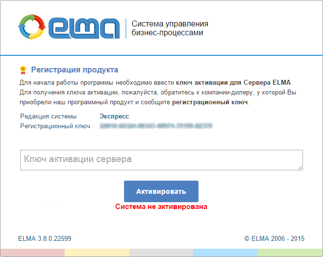 Предварительно пользователю необходимо получить ключ активации системы ELMA. Ключ активации может быть получен напрямую в компании ELMA или у ее партнеров при наличии соответствующего лицензионного договора. Полученный ключ активации необходимо ввести в данное окно (рис. 1) в поле Ключ активации сервера и нажать на кнопку Активировать.