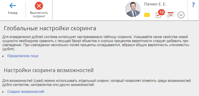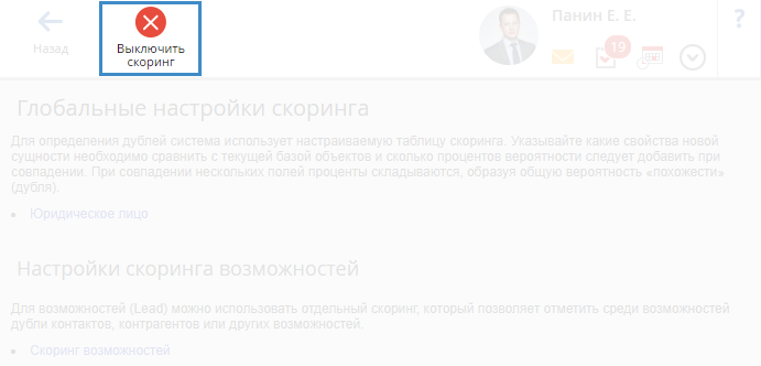 Рис. 3. Страница глобальных настроек скоринга дублей. Кнопка "Выключить скоринг"