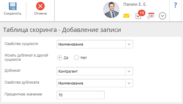 дублей возможностей и юридических лиц в системе ELMA используется настраиваемая таблица скоринга. В данной таблице осуществляется настройка свойств создаваемых возможностей и юридических лиц, по которым будет осуществляться сравнение с текущей базой
