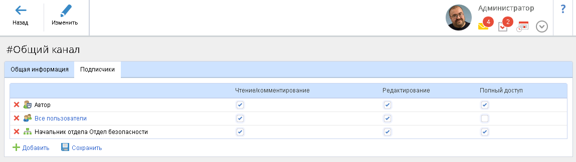 Чтение/Комментирование – права на просмотр сообщений информационного канала, а также на их комментирование.
