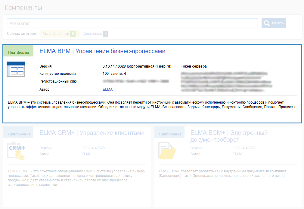 Рис. 1. Раздел "Администрирование – Система – Компоненты". Информация о лицензии на Платформу ELMA BPM
