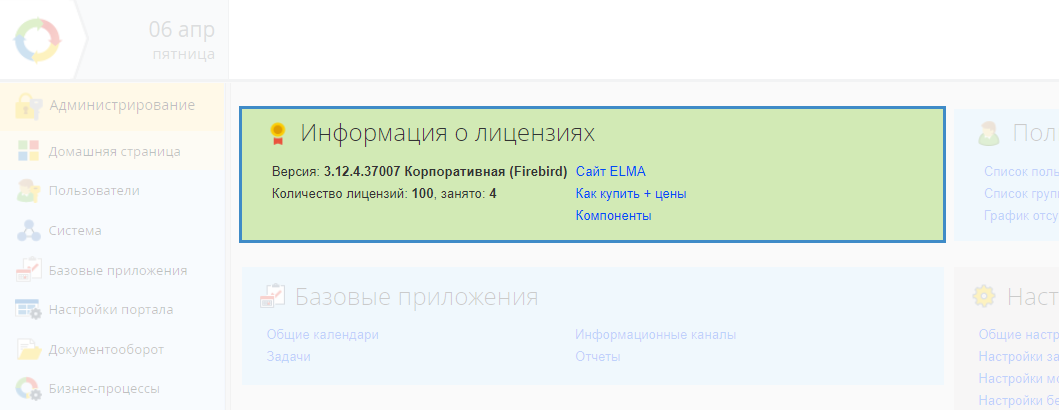 Рис. 4. Раздел "Администрирование – Домашняя страница". Количество пользовательских лицензий на Платформу ELMA BPM
