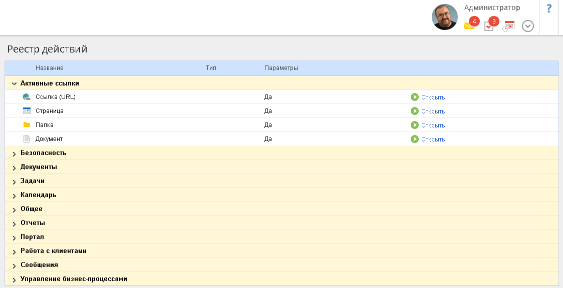 Полный список реестра действий, доступных в системе ELMA, располагается в разделе Администрирование – Настройки портала – Реестр действий(рис. 1).
