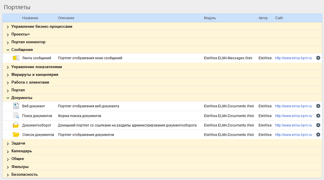 Полный список портлетов, доступных в системе ELMA, располагается в разделе Администрирование – Настройки портала – Портлеты(рис. 1).