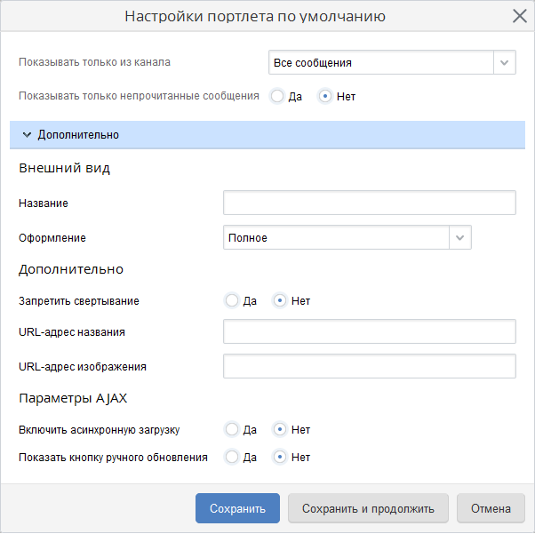 Для осуществления настройки портлета необходимо нажать на кнопку , расположенную справа от требуемого портлета. В открывшемся диалоговом окне (рис. 2) необходимо заполнить требуемые поля и нажать на кнопку Сохранить или Сохранить и продолжить. Подробнее о заполнении полей см. соответствующий раздел справки.
