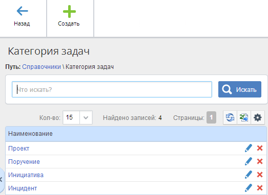 Для редактирования элемента справочника необходимо нажать кнопку напротив названия элемента. Откроется карточка элемента справочника (рис. 3). Аналогичная карточка откроется, если в списке элементов справочника Категория задач (рис. 1) нажать кнопку Создать для добавления элемента.