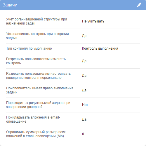 Основные параметры модуля Задачи могут быть указаны в разделе Администрирование – Система – Настройки системы или Администрирование – Базовые приложения – Задачи – Настройка модуля Задачи веб-приложения в блоке Задачи (рис. 1).