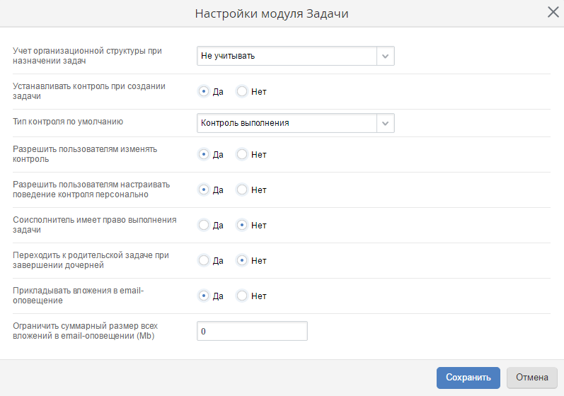 Нет – вложение не будет приложено к email-оповещению при назначении задач (за исключением задач по документам) и об изменениях в них.
