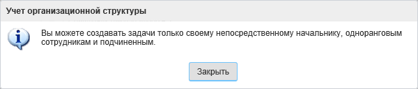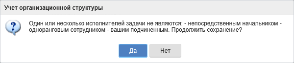 Разрешить, но предупредить – при попытке поставить задачу сотрудникам, не являющимся непосредственными руководителями, одноранговыми сотрудниками или подчиненными пользователя, назначающего задачу, система формирует предупреждение (рис. 6). Нажатие на кнопку Да приведет к постановке задачи в системе указанным сотрудникам.