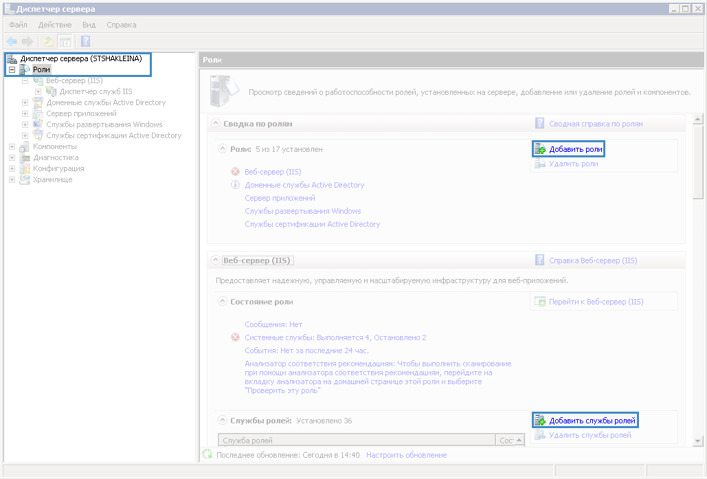 Рис. 1. Диспетчер сервера. Блок "Роли". Кнопки " Добавить роли" и "Добавить службы ролей"