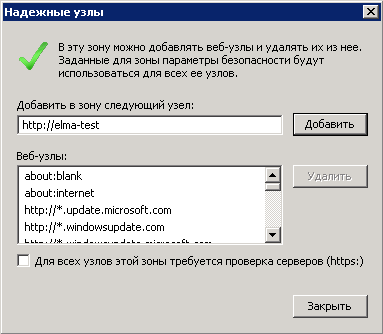 Далее требуется добавить сервер ELMA к надежным узлам. Для этого необходимо на вкладке Безопасность нажать на кнопку Узлы и в открывшемся диалоговом окне (рис. 10) нажать на кнопку Добавить, а также снять флажок Для всех узлов этой зоны требуется проверка серверов (https:). Для сохранения изменений необходимо нажать на кнопку Закрыть.
