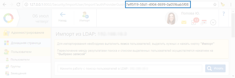 2. Раскомментировать строку < add key="SSPI.InstanceUid" value="7EFF5F19-58D1-4904-8699-0A059BAB5F08" />, изменить значение value, указав там локальный номер требуемого модуля авторизации LDAP, и сохранить внесенные изменения. Уникальный номер каждого из модулей авторизации отображается в адресной строке браузера (рис. 12) при переходе на страницу импорта пользователей из модуля (раздел Администрирование – Пользователи).