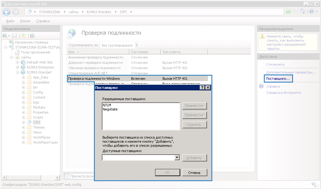 Рис. 6. Диспетчер служб IIS. Проверка подлинности Windows. Настройка поставщиков