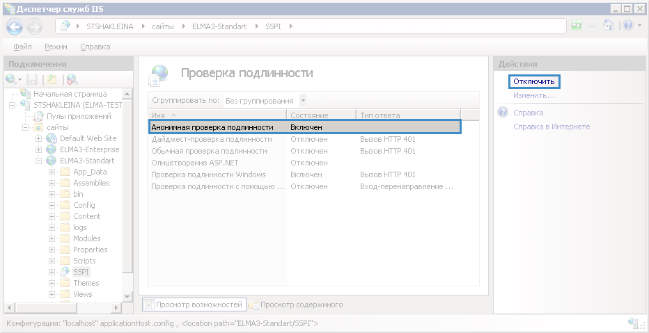 перейти в добавленное приложение SSPI – Анонимная проверка подлинности и нажать на кнопку Отключить (рис. 7).