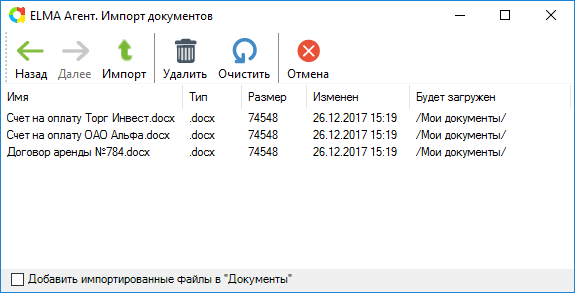 Если необходимо добавить импортированные файлы в раздел Документыпрограммы ELMA Агент, то следует установить флажок Добавить импортированные файлы в "Документы".