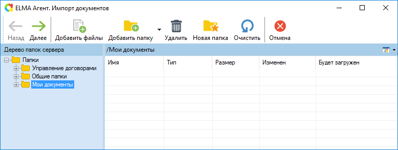 Для завершения импорта выбранных объектов следует нажать на кнопку Импорт. Файлы и папки будут загружены в систему ELMA. Окно импорта документов будет закрыто.
