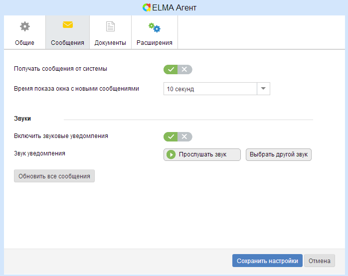 Для того, чтобы открыть настройки сообщений в ELMA Агенте, необходимо нажать на кнопку Настройки в меню пользователя и в открывшемся окне перейти на вкладку Сообщения (рис. 1).