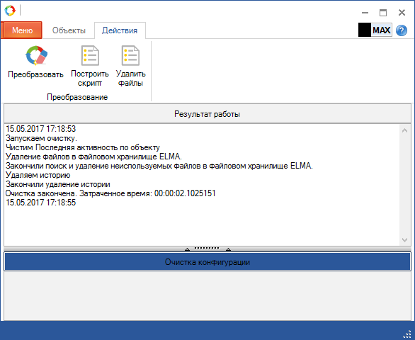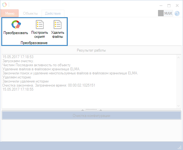 Преобразование конфигурации и базы данных в соответствии с установленными настройками на вкладке Объекты осуществляется нажатием на кнопку верхнего меню Преобразовать. При нажатии на данную кнопку будет открыто окно Очистка конфигурации (рис. 4).