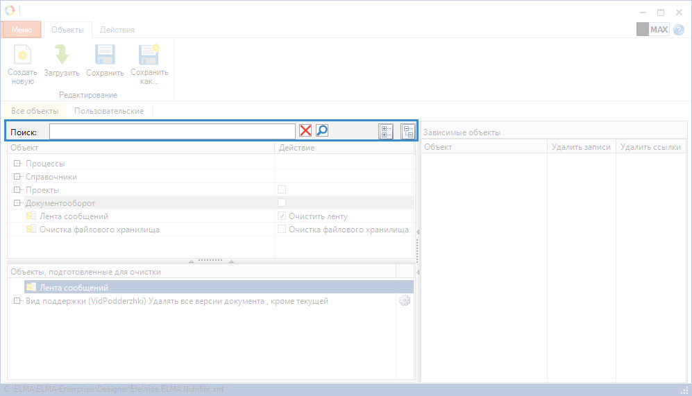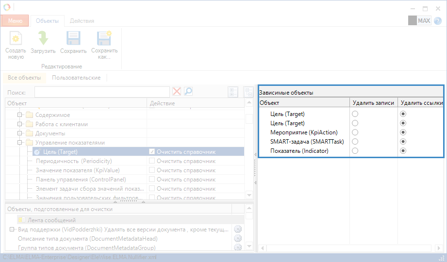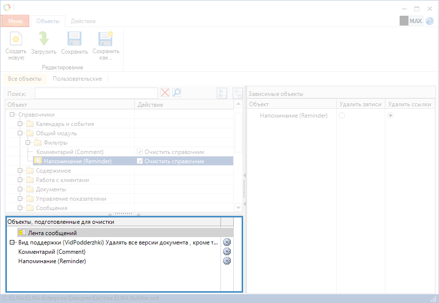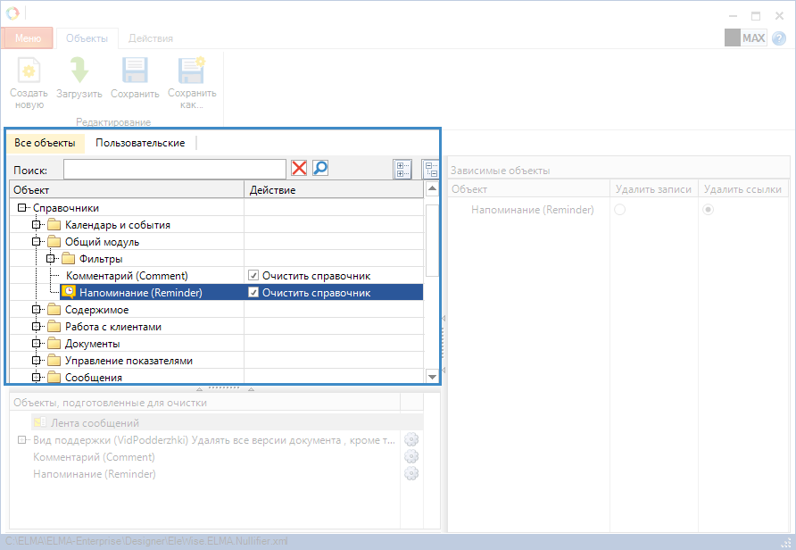 На данной вкладке осуществляется выбор экземпляров объектов для очистки, а также управление файлом настроек преобразования. Данный файл имеет расширение .xml и располагается в папке с установленной системой ELMA в папке Designer. Имя файла задается при сохранении. По умолчанию при нажатии на кнопку Сохранить файл будет иметь имя EleWise.ELMA.Nullifier.xml, а при нажатии на кнопку Сохранить как… доступно изменение названия и расположения данного файла.