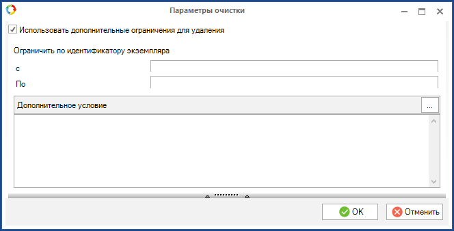 Ограничить по идентификатору экземпляра – в поля с и По необходимо ввести начальное и конечное значения идентификатора экземпляра объекта. Экземпляры объекта из данного интервала будут удалены.