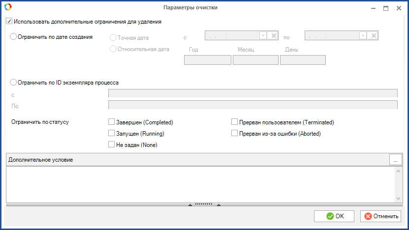 День необходимо указать относительный временной период, до начала которого требуется произвести очистку. Экземпляры процесса, запущенные ранее указанного периода, будут удалены. При этом также учитывается дата и время запуска очистки. В случае, переключатель установлен в положение