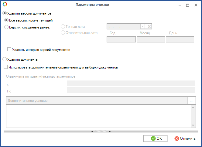 Удалять версии документов – при установке переключателя в данное положение из системы могут быть удалены следующие версии документов: