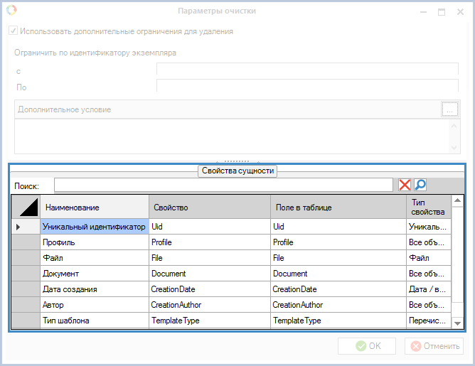 Рис. 7. Окно "Параметры очистки". Таблица "Свойства сущности"