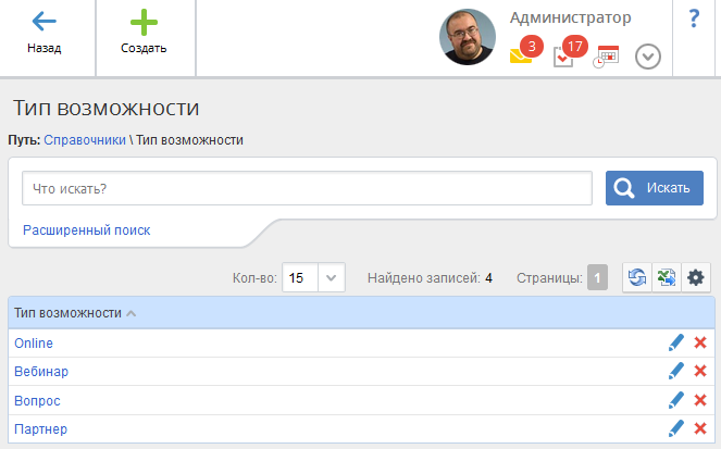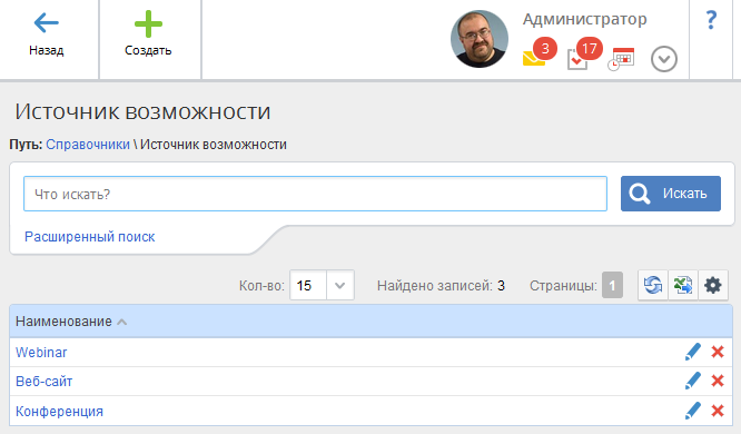 Данный справочник (рис. 1) предназначен для хранения списка источников возможностей, которые используются для классификации клиентов. Записи данного справочника используются при создании возможности. Данные источники отражают тип первого контакта с клиентом. Источник возможности подобен маркетинговому воздействию.