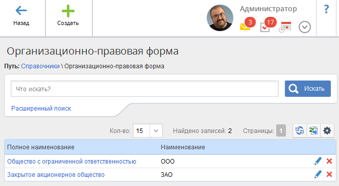 В данном справочнике (рис. 2) отображается список возможных организационно-правовых форм компаний-контрагентов. Записи данного справочника используются при работе с юридическим лицом и возможностью.
