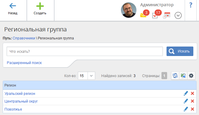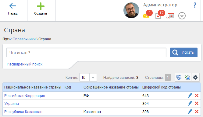 В данном справочнике (рис. 5) отображается список стран, в которых могут располагаться контрагенты. Записи данного справочника используются при работе с контрагентами, контактами и возможностями. Данный справочник может быть заполнен как вручную, так и автоматически (с использованием провайдера адресов ФИАС).