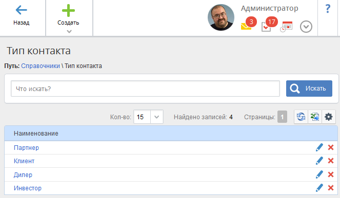 В данном справочнике (рис. 8) отображается список типов контактов. Записи данного справочника используются при работе с контактами.