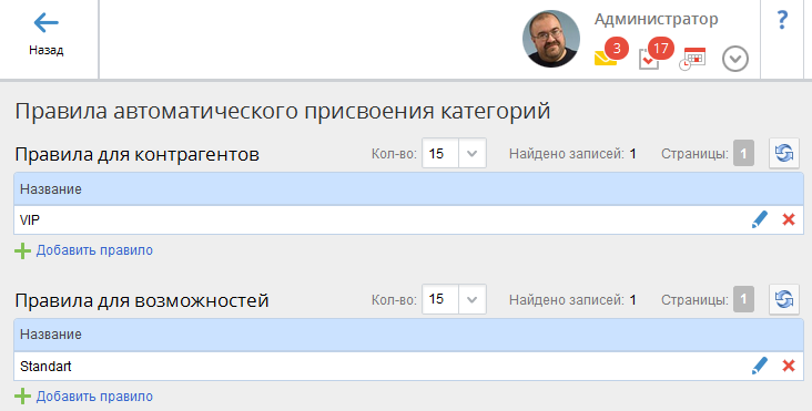 В системе ELMA для контрагентов и/или возможностей могут быть созданы правила автоматического присвоения категорий. Настройка правил осуществляется в разделе Администрирование – Настройки CRM – Правила назначения категорий.