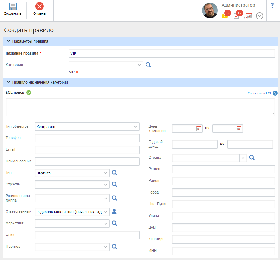 Например, при создании контрагента с типом "Партнер" и ответственным "Радионов Константин" (рис. 2), данному контрагенту будет автоматически присвоена категория "VIP".