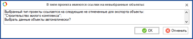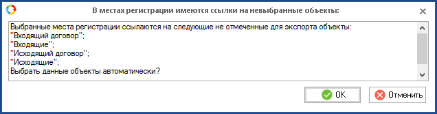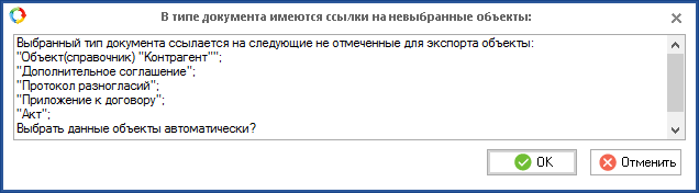 Следует отметить, что при наличии в системе связанных объектов и выборе в данном диалогом окне только одного из них, система выдаст уведомление (рис. 10) о другом связанном объекте, который также необходимо экспортировать. В том случае, если будут экспортированы не все связанные объекты, в дальнейшем это может привести к возникновению конфликтов в системе во время
